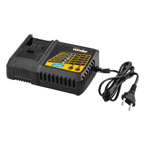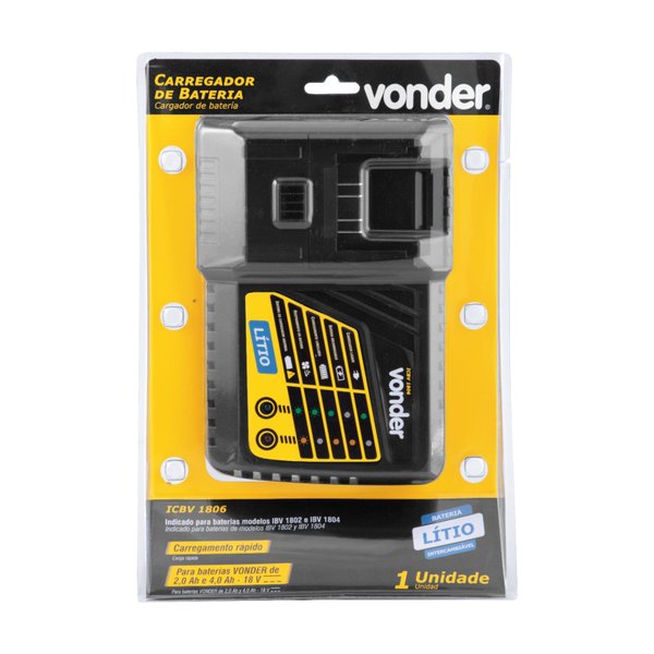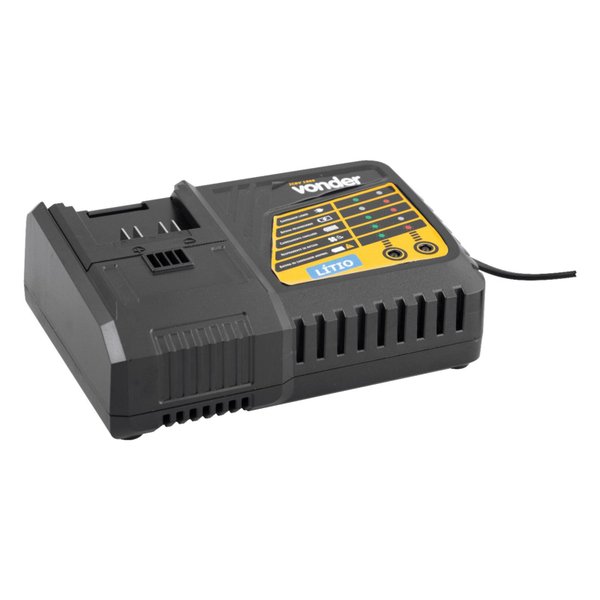 Indicado para carregar as baterias da linha intercambiável VONDER, modelos: (2 Ah) IBV 1802 - 60.04.180.200 (4 Ah) IBV 1804 - 60.04.180.400 (5 Ah) IBV 1850 - 60.04.185.000 (8 Ah) IBV 1880 - 60.04.188.000 Carregador com carregamento rápido.